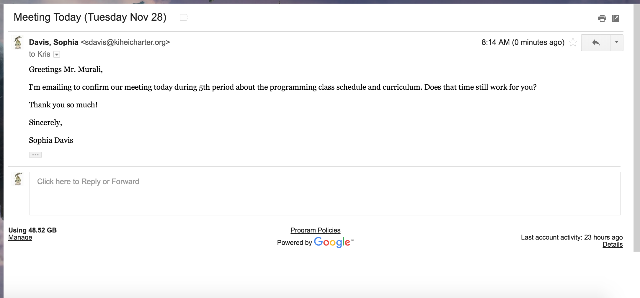 I would like to have a meeting with Mrs. Alexander about my project progression sometime during the week of December 5th, as I have important things to update her on (such as the tentative dates for the class I’m teaching). I would hope to meet with her on December 5th during class, however before class or on December 7th would definitely also be doable.