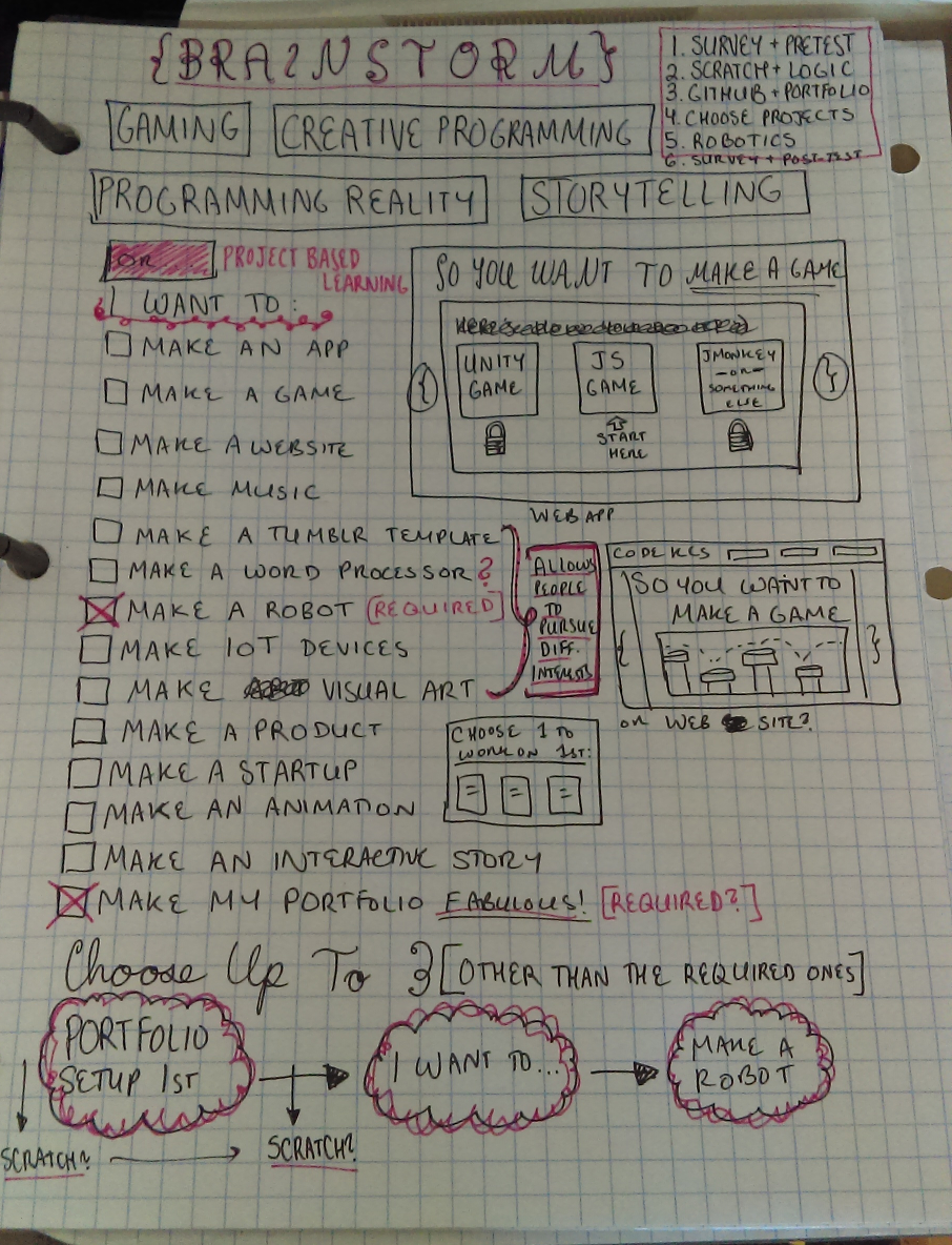 I was changing the way the curriculum was organized, to cater to students’ different interests. Not only is this a substantially simpler system, it removes some of the constraints that I was experiencing when I tried to make more specialized learning paths. It gives the students even more power over what they choose to learn in the class, without me having to do any extra work (since all the projects already existed in my previous organization - now they’re all available to every student by clicking checkboxes). Finally, I feel that this system is more transparent and more true to my vision of project based learning. The students don’t just choose a general topic they’re interested in, rather they get to choose the specific projects that they’d like to build.